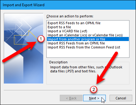 The Import and Export Wizard dialog box displays. Select “Import from another program or file” under Choose an action to perform and then click the “Next” button.